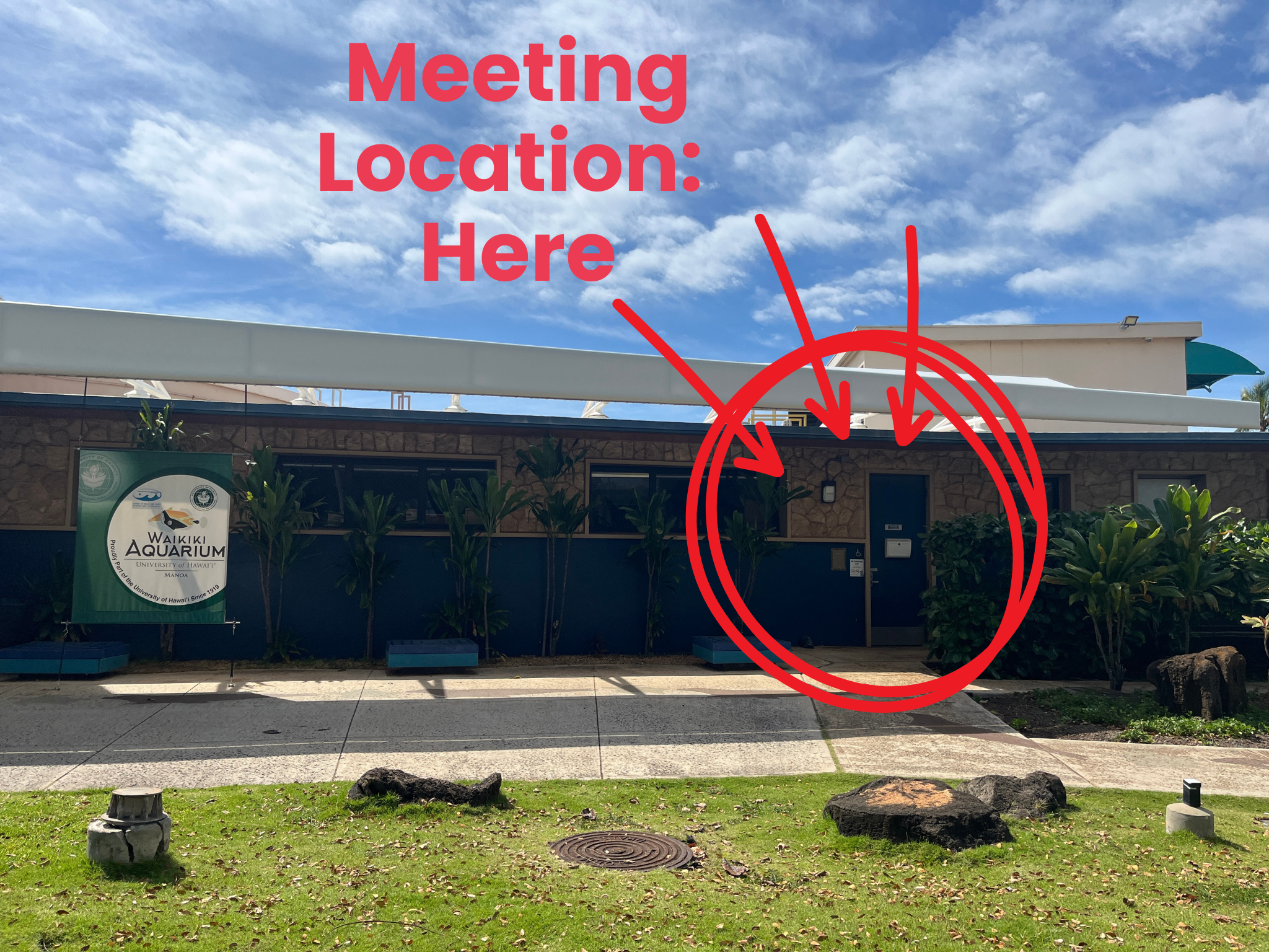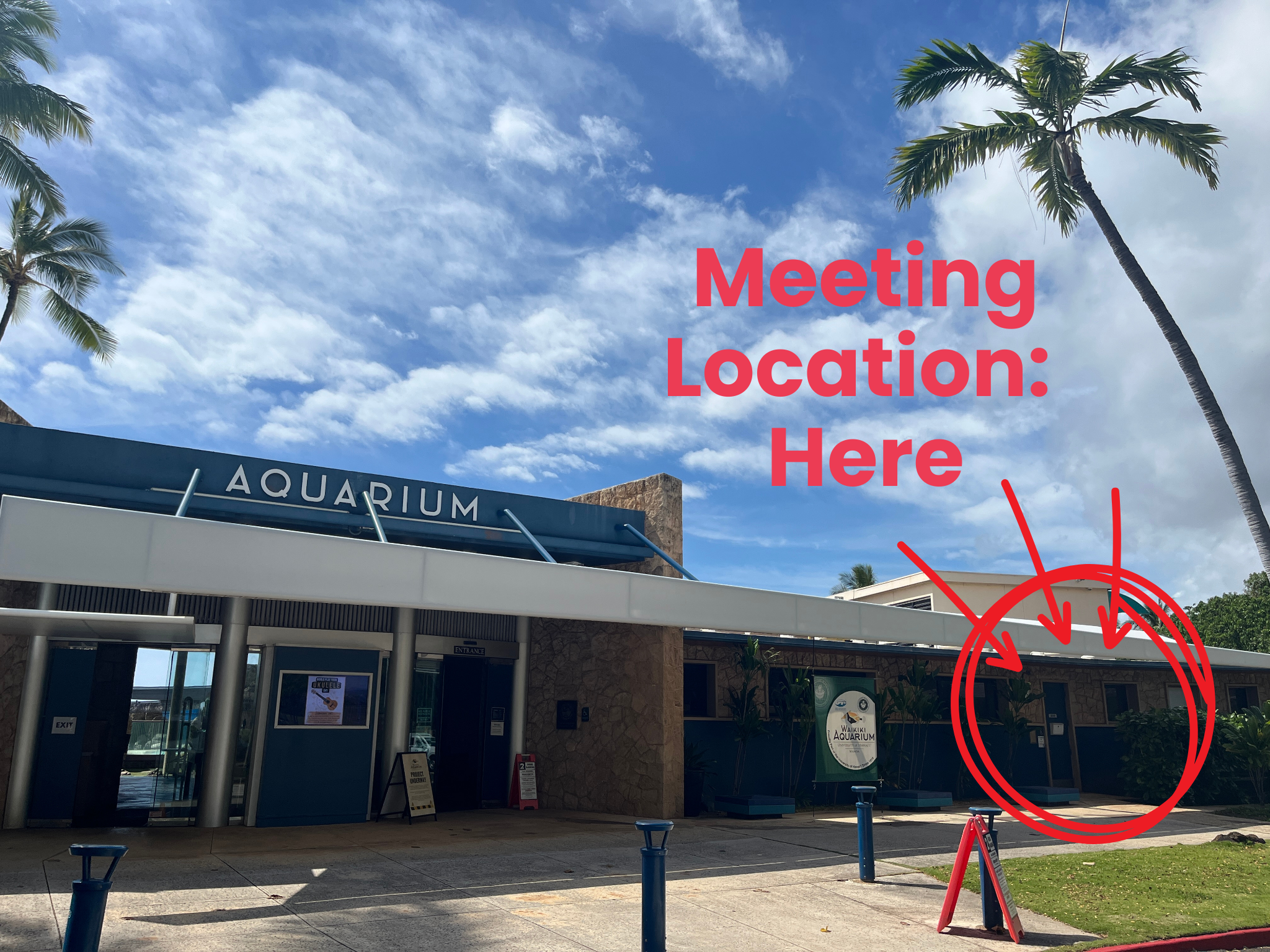 The meeting location is in front of the door next to the Aquarium entrance.